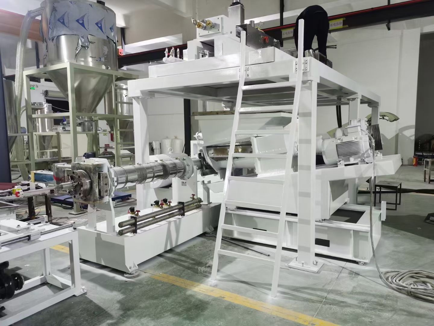 正是因為設備本身已經越來越無法滿足客戶的需要,因此連續密煉機才成為當下客戶更滿意的共混設備。雙轉子連續密煉機也叫連續式密煉機,它結合了密煉機優異的混合特性和雙螺桿擠出機連續工作的特點,具有極強的填充、分散混合能力,節能效果良好。采用基于高拉伸的混沌型轉子,使塑料在連續混煉機內的熔融過程呈現離散熔融狀態,提高傳熱效率和熔融速度;通過在連續混煉機的熔融區和混煉區之間建立起能量耦合,利用混煉過程中產生的熔融耗散熱,滿足固體樹脂熔融過程中對熱量的需求;通過在混煉場中建立高效的拉伸流動,提高混煉效率。終使整個混煉過程的能量消耗大幅降低。